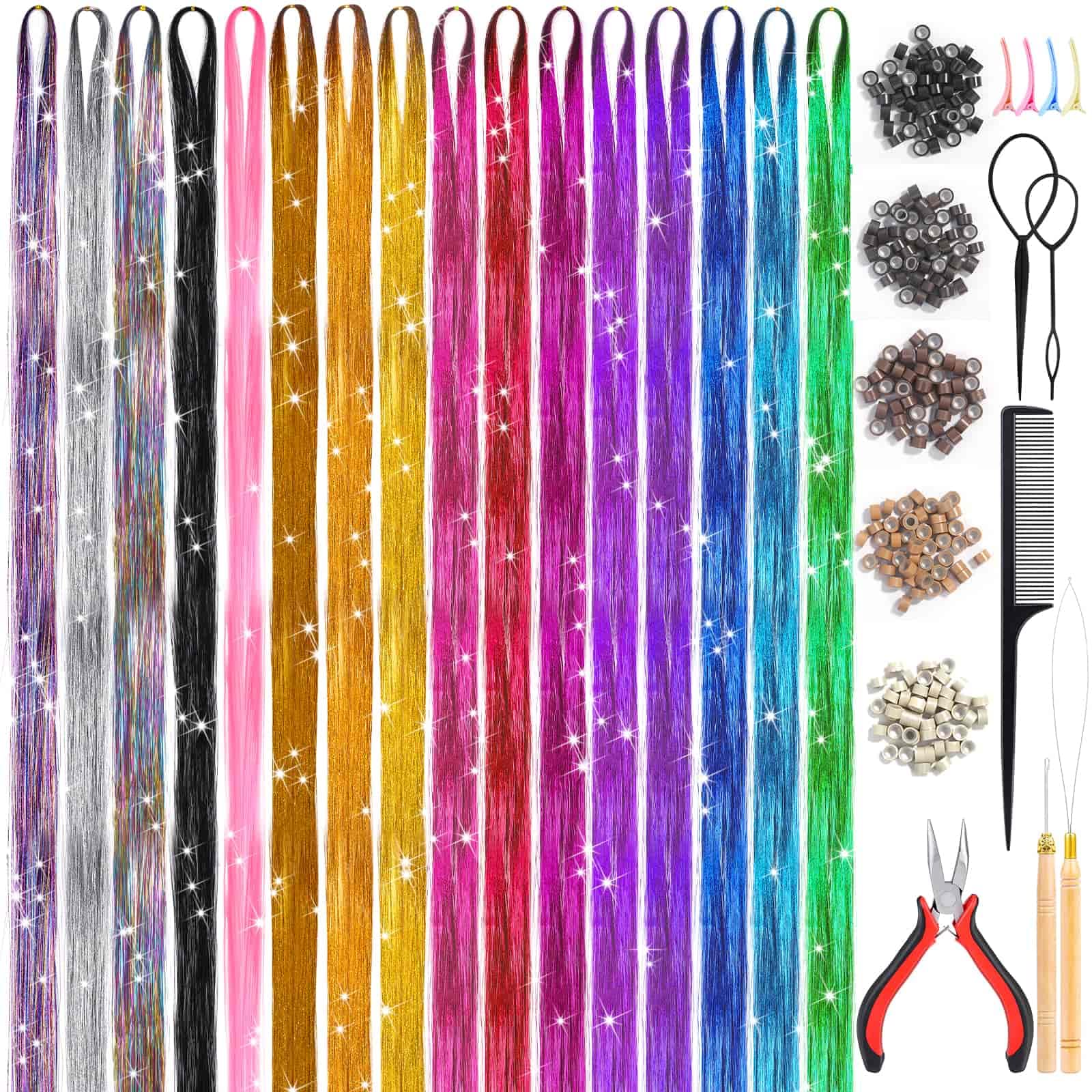 Hair Tinsel Kit (48 Inch, 16 Colors, 3200 Strands), Glitter Sparkling Tinsel Hair Extensions with Tools, Heat Resistant Fairy Hair Tinsel Kit for Women Girls Cosplay Party Festival Hair Accessories